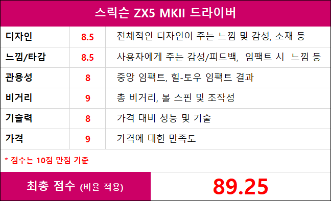 스릭슨 드라이버들의 특징은 주로 볼 스피드와 비거리에 집중되었고 이번 MKII 역시 마찬가지입니다. 하지만, 시타에서 느낀 점은 ZX5 모델은 치기가 상당히 편한 느낌을 받았습니다. 그뿐만 아니라, 똑바로 보내기에도 매우 수월했고 관용성이 아주 좋다고 생각합니다.