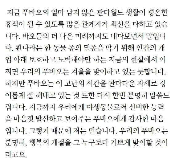 지금 푸바오의 얼마 남지 않은 판다월드 생활이 평온한 휴식이 될 수 있도록 많은 관계자가 최선을 다하고 있습니다. 바오들의 더 나은 미래까지도 내다보면서 말입니다. 판다라는 한 동물 종의 멸종을 막기 위해 인간의 개입 아래 보호하고 노력해야만 하는 지금의 현실에서 어쩌면 우리의 푸바오는 겨울을 맞이하고 있는 듯합니다. 하지만 푸바오는 이 고난의 시간을 판다다운 자세로 경이롭게 잘 해내고 있는 것 또한 다시 한번 분명히 말씀드립니다. 지금까지 우리에게 야생동물로써 신비한 능력을 마음껏 발산하고 보여주는 푸바오에게 감사한 마음입니다. 그렇기 때문에 저는 믿습니다. 우리의 푸바오는 분명히, 행복의 계절을 그 누구보다 기쁘게 맞이할 것이라고요.