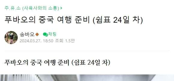 공지가 나온 후부터 몇 시간 후, 늦은 저녁 '송바오' 송영관 사육사도 에버랜드 주토피아 공식 카페에 글을 하나 작성했습니다. 푸바오의 내실 생활 10일차, 17일차에 이어 내실 생활 24일차의 소식을 알리는 글이었죠. 이 글에 많은 사람들이 눈시울을 붉히고 있다고 하는데요. 함께 살펴보겠습니다.