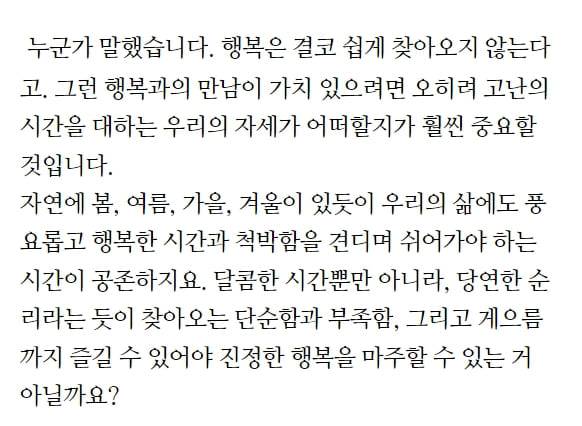 누군가 말했습니다. 행복은 결코 쉽게 찾아오지 않는다고. 그런 행복과의 만남이 가치 있으려면 오히려 고난의 시간을 대하는 우리의 자세가 어떠할지가 훨씬 중요할 것입니다.
