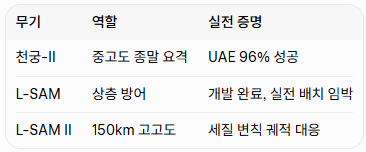 이란의 실제 미사일 공격을 상대로 중동 사막 환경에서 입증된 결과입니다. L-SAM 역시 개발 단계에서 이미 다수의 모의 요격 시험을 통과했으며, 가성비·즉응성·국산화율 면에서 미국 사드보다 우위라는 평가가 이어지고 있습니다.