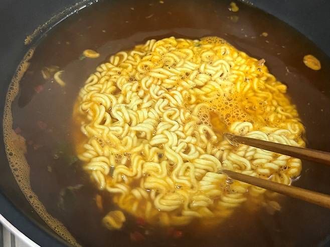 라면을 삶을 때는 중간중간 면발을 들어 올려서 공기와 접촉해 주면 훨씬 탱탱하고 쫄깃한 면발이 됩니다. 공기와 닿으면서 순간적으로 온도 차가 생겨 면발이 탱탱해집니다.