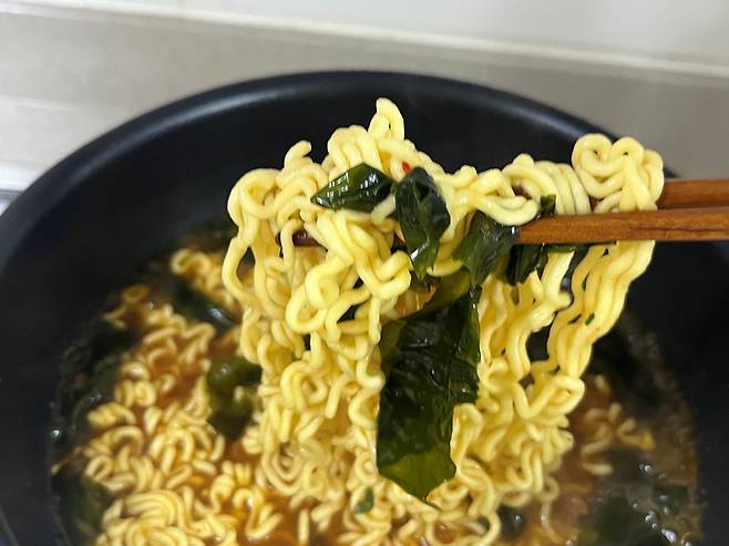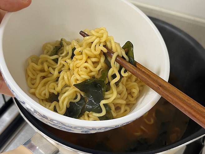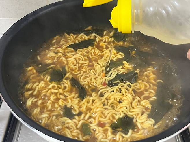 면발과 함께 불린 미역을 넣어 보세요. 미역 특유의 감칠맛이 육수에 배어들어, 라면 국물이 더 시원하고 담백해집니다. 또한 미역이 라면의 기름진 맛을 중화해 속이 훨씬 편안합니다.
