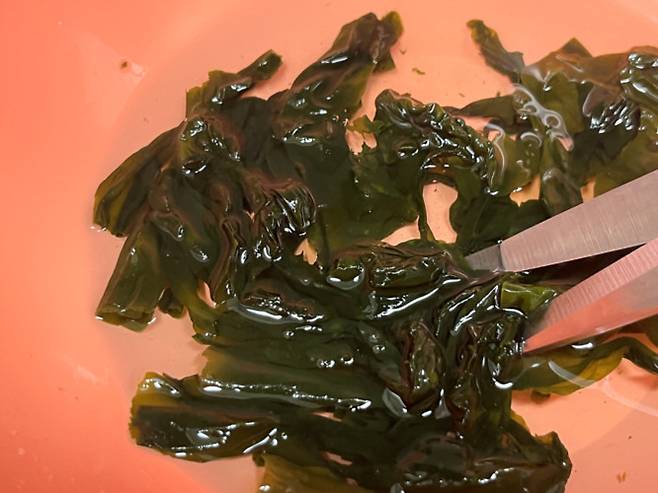 미역은 아주 소량만 덜어서 물에 불려 줍니다. 약 10분 불리고 가위로 잘게 잘라 주세요.