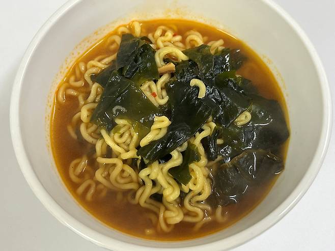 미역에 들어 있는 요오드, 칼슘, 마그네슘 등이 국물에 퍼져 나와, 라면이 더욱 영양가가 높아집니다. 특히 미역의 알긴산 성분은 국물 속 나트륨을 흡착해 체외 배출을 도와주는 효과가 있습니다.