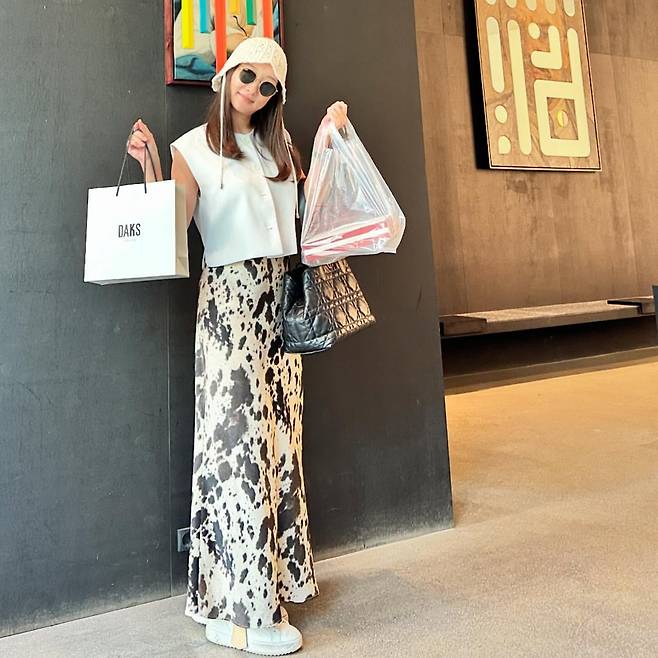화이트 민소매 톱에 애니멀 패턴의 맥시스커트를 조합해 편안하면서도 트렌디한 스타일을 완성했다. 화이트 베레모와 선글라스로 파리지엔 감성을 더하며, 쇼핑백을 들고 있는 모습에서 일상 속에서도 패션에 대한 세심한 배려를 엿볼 수 있다.