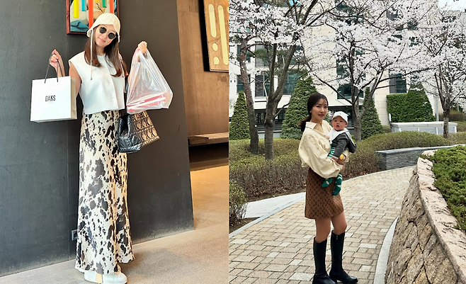 이인혜는 만개한 벚꽃을 배경으로 크림색 오버사이즈 스웨터와 브라운 톤의 패턴 미니스커트를 매치해 세련된 봄 룩을 연출하고 있다. 무릎까지 올라오는 블랙 롱부츠로 다리 라인을 강조하며, 아기를 안고 있는 모습에서도 편안하면서도 스타일리시한 모성미를 보여주고 있다.