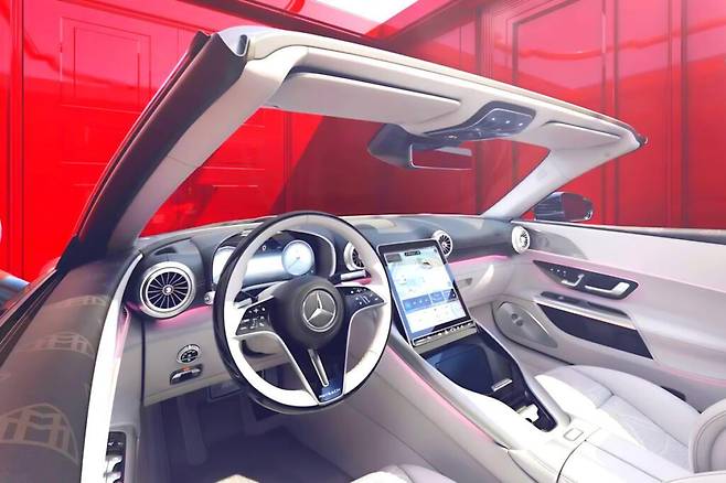 실내는 ‘마이바흐다운’ 호화로움으로 가득하다. 제시된 이미지에서는 밝은 톤의 가죽 마감과 금속 질감의 원형 환기구, 대형 디스플레이 패널, 삼각별이 새겨진 스티어링 휠이 조화를 이루며 고급스러운 분위기를 연출한다. 지붕을 열고 달려도 쾌적함을 유지하도록 에어로 패널이 장착돼 실내로의 바람 유입을 최소화한다.