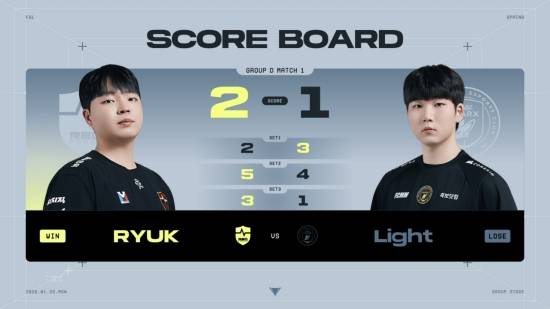 세 번째 경기는 그룹D M1 농심 레드포스(NS) 'RYUK' 윤창근 선수와 BNK 피어엑스(BFX) 'Light' 김선재 선수의 대결.