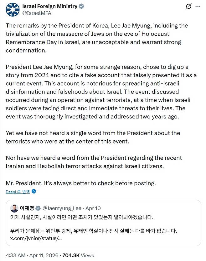 | ▲ 이스라엘 외무부는 11일 오전 X 계정에 전날 2년 전 이스라엘 군의 팔레스타인 무장 대원 시신 유기 영상을 공유한 이재명 대통령을 향해 :이스라엘의 홀로코스트 추모일 전날, 유대인 학살 사건을 경시하는 발언을 포함한 이재명 한국 대통령의 발언은 용납할 수 없으며 강력히 규탄 받아야 마땅하다"고 비판했다. |