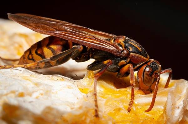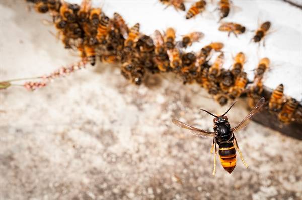 | ▲ 등검은말벌. 꿀벌 주위를 날아다니며 한 마리씩 낚아 채 잡아먹는다. |