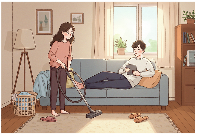 맞벌이 부부의 경우 특히 이 문제가 더욱 분명해지는데, 어느 한쪽에게만 가사 부담이 집중되면 심리적 스트레스와 갈등이 발생할 수밖에 없습니다.