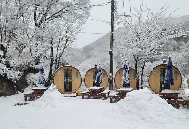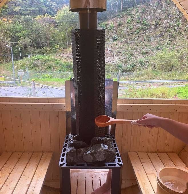 통나무 안에는 창문이 있어서 바깥 풍경을 볼 수 있기에 눈이 오는 겨울에는 북유럽에 온 듯 멋진 풍경을 볼 수 있을 거야. 사우나 후에는 직접 만든 시원한 식혜와 도토리 묵도 꼭 맛보기! 가격은 3시간 이용, 2인 기준 35,000원.