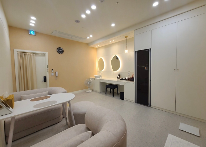모든 공간을 프라이빗하게 사용할 수 있는 사우나를 찾는다면 개운으로 가봐. 오픈한 지 두 달 밖에 되지 않아 더욱 깔끔해. 예약한 룸으로 들어가면 머리를 말리고 화장도 할 수 있는 널찍한 공간이 나와.