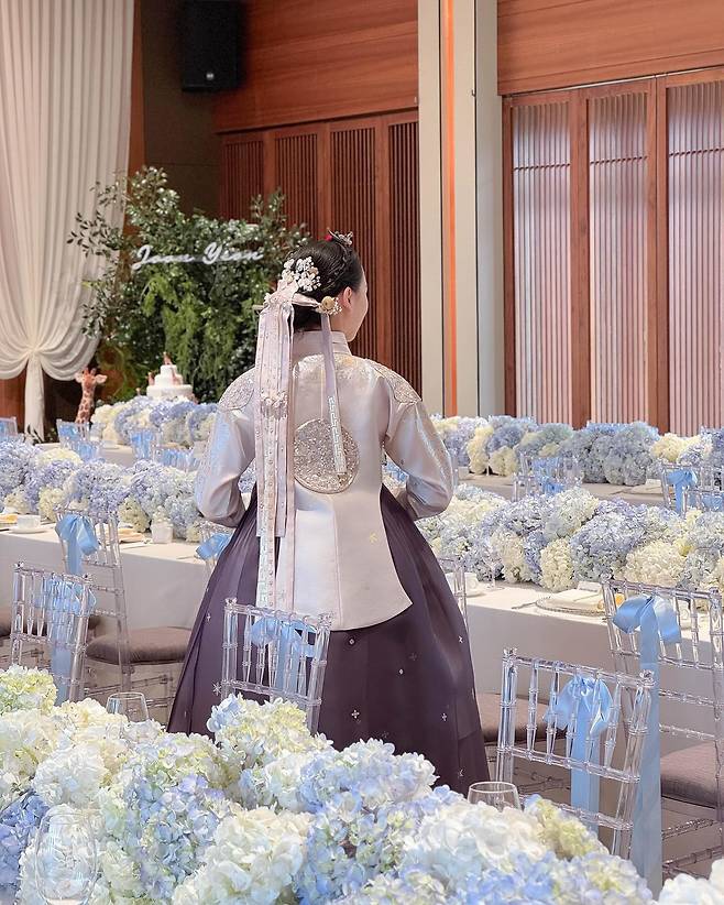 사진 속 손연재는 단아한 한복을 입고 아이의 첫 돌을 기념하고 있습니다.