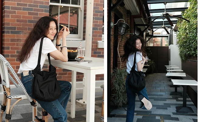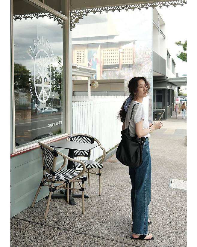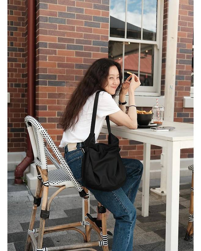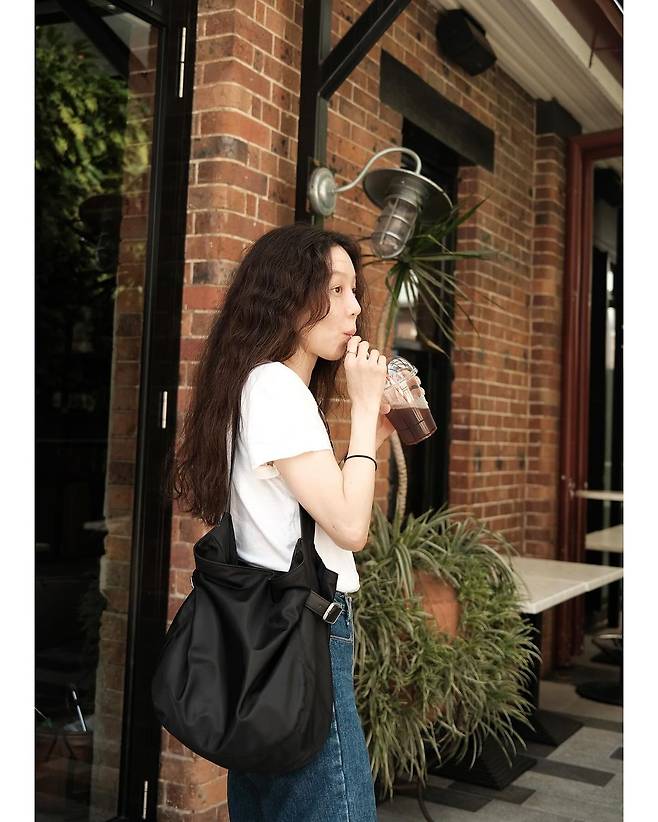 사진 속 정려원은 흰티와 청바지를 입고 블랙 숄더백을 메고 캐주얼하면서 스타일리쉬한 코디를 선보였다.
