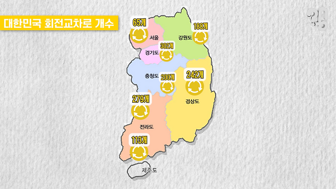 먼저, 서울 이외 지역에 회전교차로가 많다는 게 사실인지 알아보기 위해 한국교통연구원 자료를 찾아봤다. 2022년 기준, 서울엔 65개의 회전교차로가 있고, 경기도엔 302개, 강원도엔 188개, 충청도엔 200개, 경상도엔 242개, 전라도 279개, 제주도엔 113개가 있다. 확실히 서울에 회전교차로가 적었다. 왜 그런 걸까? 국토교통부 회전교차로 제도를 담당하는 분이 있어 물어봤다.