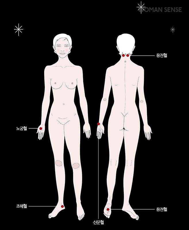 발가락을 제외하고 발바닥을 3등분했을 때 가장 위에 위치하는 자리로 우리 몸의 기가 솟는 혈자리다. 지압 시 몸이 이완되며 두통과 불안감이 개선되고, 혈액순환을 촉진해 피로 해소와 숙면을 돕는다. 용천혈을 엄지손가락으로 꾹 누르고 발가락 방향으로 열이 나도록 문지르는 것이 지압법. 지압 전 따뜻한 물에 족욕을 한 뒤 지압하는 것도 숙면을 돕는다.