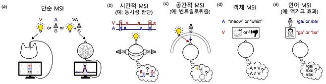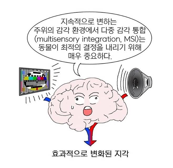 뇌에서 여러(다중) 감각 입력이 통합되는 과정을 다중 감각 통합(Multisensory Integration, MSI)이라고 한다. 위 사례에서 시각과 미각 또는 시각과 청각이 동시에 통합돼 지각된 것도 뇌의 MSI 능력 덕분이다. MSI는 물리적 특징이 지속적으로 변화하는 복잡한 환경에서 동물이 최적의 행동을 유연하게 결정하는 데 매우 중요하다 (그림 1).