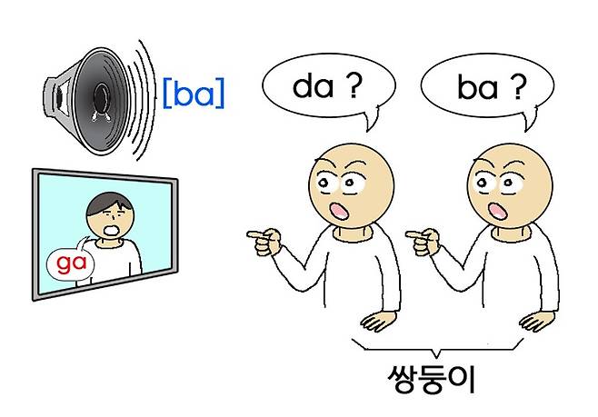 다양한 포유류 종을 대상으로 한 연구에 따르면, 학습은 여러 뇌 영역에서의 감각 반응을 변화시키고 서로 다른 감각 정보가 일치하는지 여부를 파악할 수 있게 한다. 이런 뇌에서의 감각 반응 변화는 다중 감각 통합의 정도를 변화시킬 수 있다. 예를 들어, 글 시작에서 소개한 것처럼 화자의 얼굴과 입 모양이 실제로 들린 목소리와 불일치하는 사례가 있다. 맥거크(McGurk) 효과가 대표적이다. 맥거크 효과는 발음된 음소에서 시청각 불일치가 일어날 때 일어나는 착각적 지각이다. 예를 들어, ‘ga’를 발음하는 사람의 얼굴 영상을 ‘ba’라는 청각 자극과 함께 제시할 때, 성인의 75% 이상이 ‘da’로 지각한다고 보고한다. 흥미롭게도, 약 50%의 아동은 이러한 착각을 경험하지 않고 시청각 충돌을 해결할 때 청각적 우세성을 보인다. 이는 인간이 언어 지각에서 시각과 청각의 일치성을 학습함에 따라 맥거크 착각이 더 강하게 나타나게 됨을 뜻한다 (그림 3).