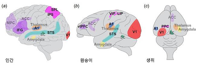 해부학적 신경 회로가 밝혀지고 전기생리학 및 신경 영상 실험이 이뤄지면서 포유류의 뇌에서 MSI에 중요한 여러 핵심 영역이 밝혀졌다(그림 4). MSI가 처음 확인된 뇌 영역은 상구(superior colliculus. SC)다. 고양이와 영장류를 대상으로 한 초기 연구를 통해, SC가 공간에서 다중 감각 자극의 정확한 공간상 위치 표상에 중요한 역할을 한다는 것을 확인했다. SC뿐만 아니라, 여러 다른 피질 영역도 MSI의 주요 영역으로 확인됐다.