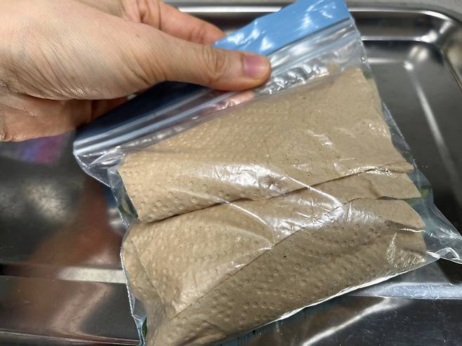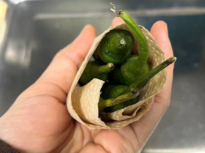 고추를 이렇게 키친타월에 감싸서 보관하면 수분을 효과적으로 흡수해 곰팡이나 무르는 현상을 크게 줄일 수 있습니다.