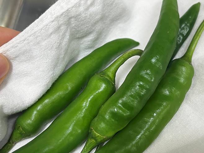고추는 세척하지 않은 상태로 겉에 있는 수분을 최대한 닦으세요. 그리고 키친타월에 5~6개씩 고추를 놓습니다.