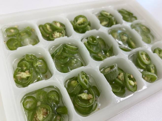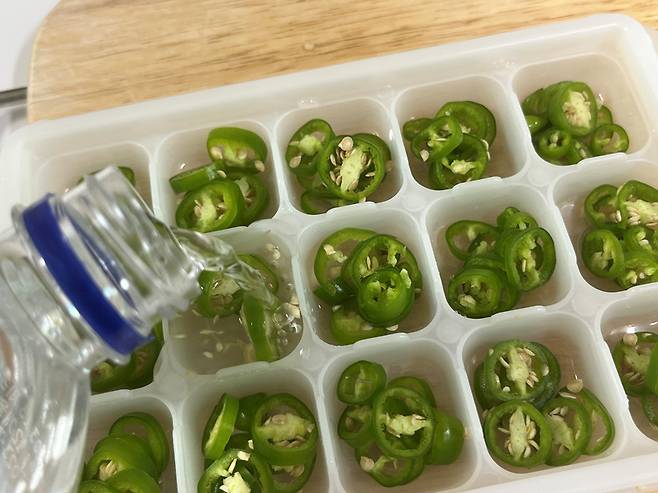 얼음틀에 물을 붓고 그대로 얼립니다. 이렇게 하면 손질한 청양고추 큐브가 만들어지는데, 나중에 요리할 때 녹일 필요 없이 그냥 넣어서 익히면 됩니다.