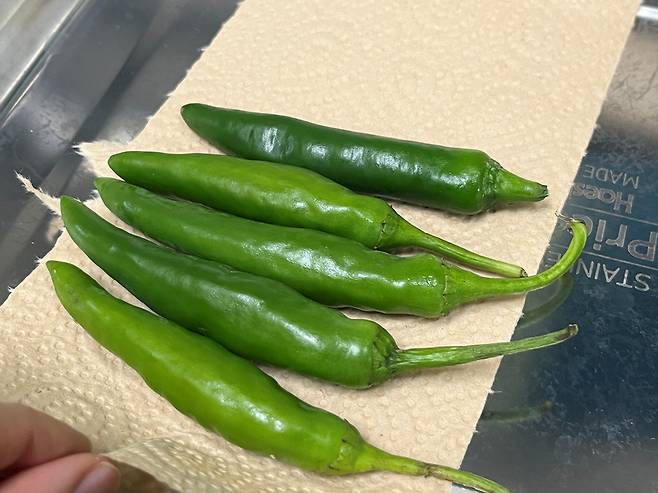 고추는 세척하지 않은 상태로 겉에 있는 수분을 최대한 닦으세요. 그리고 키친타월에 5~6개씩 고추를 놓습니다.