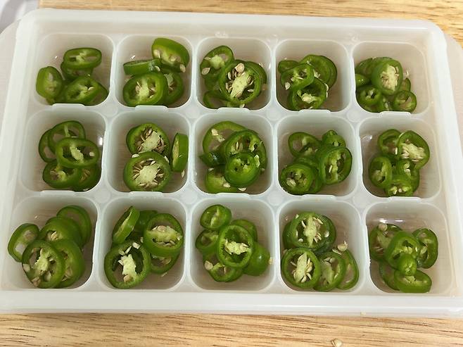 얼음틀에 물을 붓고 그대로 얼립니다. 이렇게 하면 손질한 청양고추 큐브가 만들어지는데, 나중에 요리할 때 녹일 필요 없이 그냥 넣어서 익히면 됩니다.
