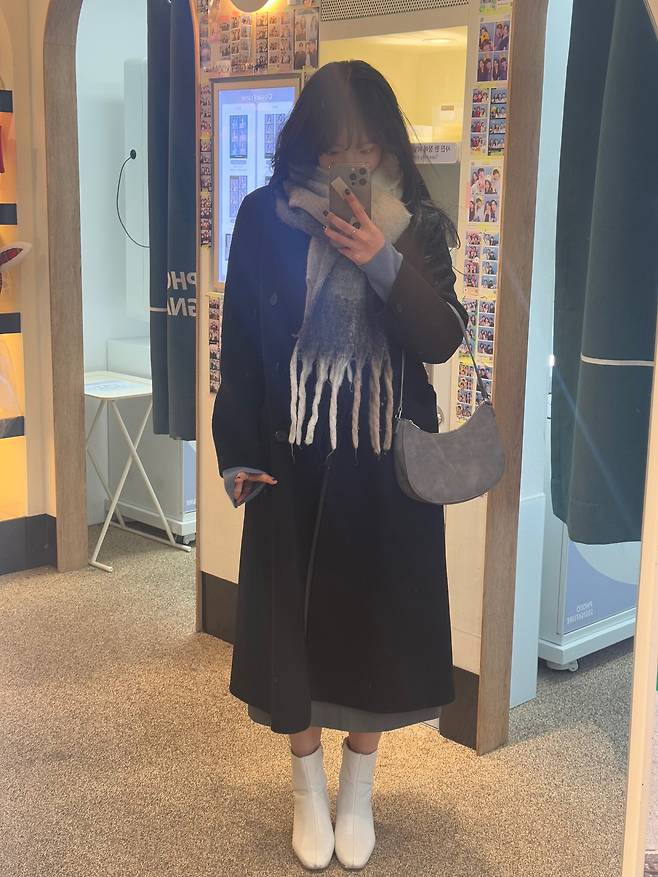 대신 이동할 때나 밖에서는 따뜻함이 최우선이라 두툼한 롱 코트와 머플러로 꼼꼼하게 감싸줬어요.