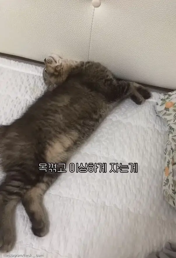 [노트펫] 잠에 너무 취한 나머지 목을 꺾어 독특한 자세로 자던 고양이의 모습에 집사가 깜짝 놀라는 일이 있었습니다.