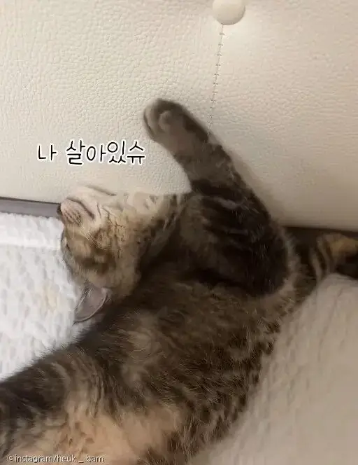 흑밤이는 그냥 깊은 잠에 빠져있었던 것인데요. 마치 '나 살아있슈'라고 하는 듯 무심하게 앞발과 뒷발을 쓱 들어 보이곤 다시 잠에 빠지는 모습이 엉뚱하고 귀엽네요.