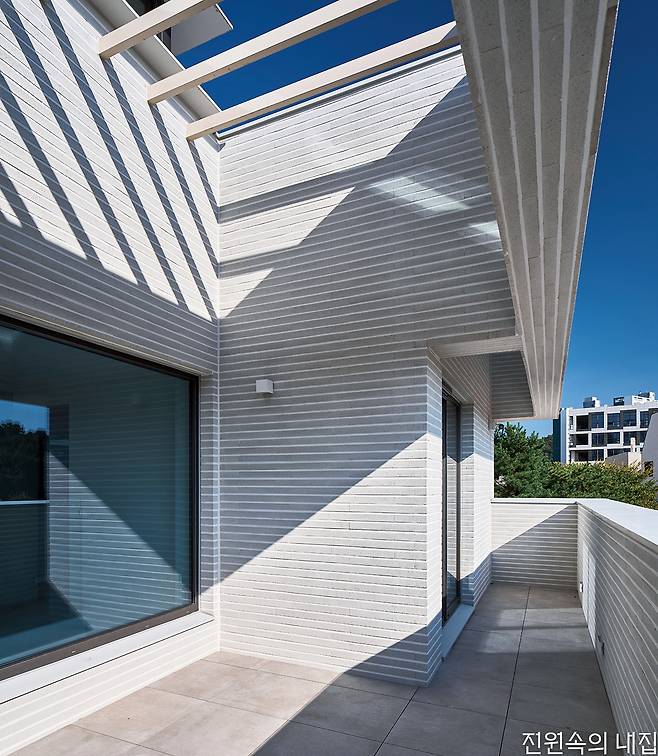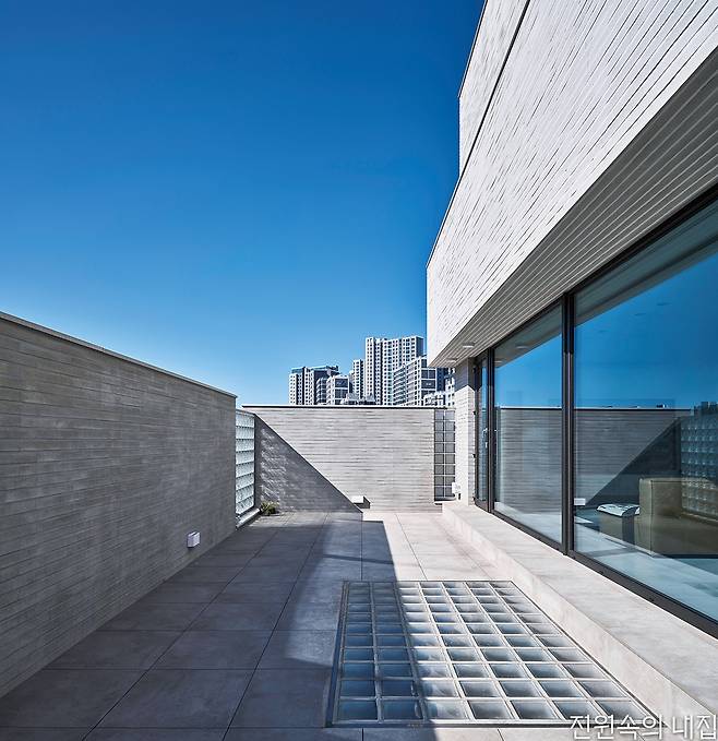 건물은 전체적으로 계단식이다. 2층은 1층보다 뒤로 물러서 테라스를 만들고, 그 위 옥상 테라스도 셋백 되어 넉넉한 옥상이 만들어졌다. 층이 오르면서 집이 뒤로 물러나면 내부 공간의 시선은 더 열리고 외부 시선 차단엔 용이해진다. 남쪽으로 충분한 일조와 조망을 확보하고 프라이버시는 효율적으로 해결해 준다.
