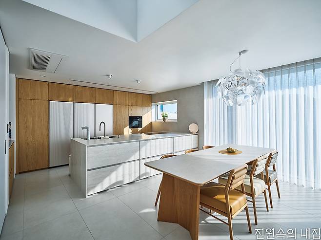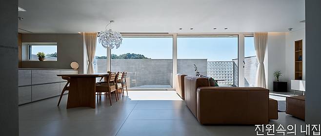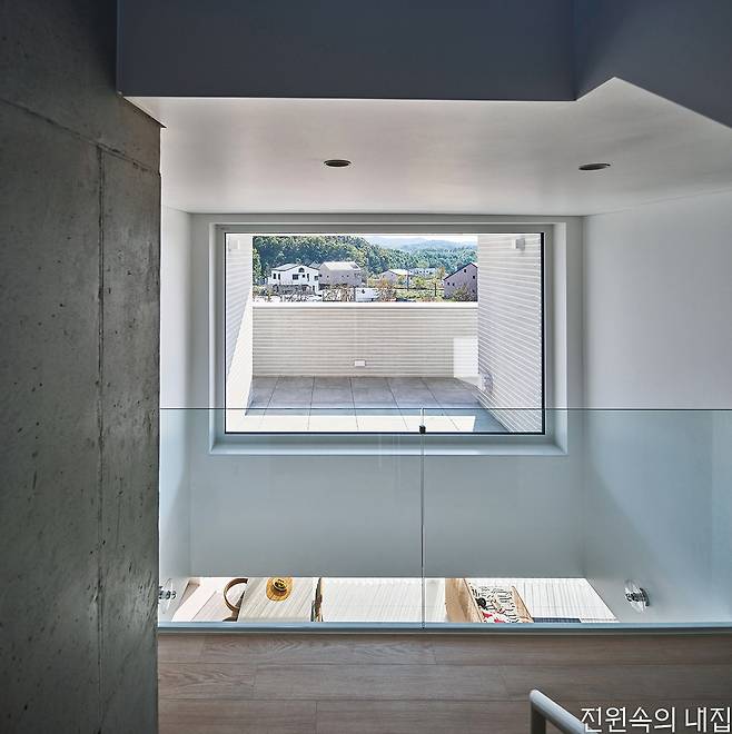 대지는 한층 높이 이상 들어 올려진 성토 부지였다. 남쪽은 낮은 지대로 단지 내 도로와 접하며 집의 자연스러운 지하층 출입구가 형성된다. 지하층은 취미실과 창고, 선큰, 현관이 있다. 계단을 통해 한층 오르면 갑자기 확 트인 거실과 주방, 테라스와 그 너머의 열린 조망이 펼쳐진다. 대지 단차로 자연스럽게 만들어진 1층 테라스는 거실, 주방 공간과 면적이 같다. 큰 창을 통한 시각적 확장은 테라스를 실내공간의 연장처럼 느껴지게 한다.