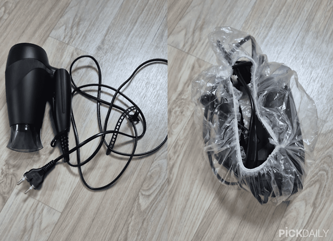 헤어캡은 의외로 여행갈 때 빛을 발한다. 헤어캡은 드라이기나 고데기 같은 지저분한 선을 정리할 때 좋다.