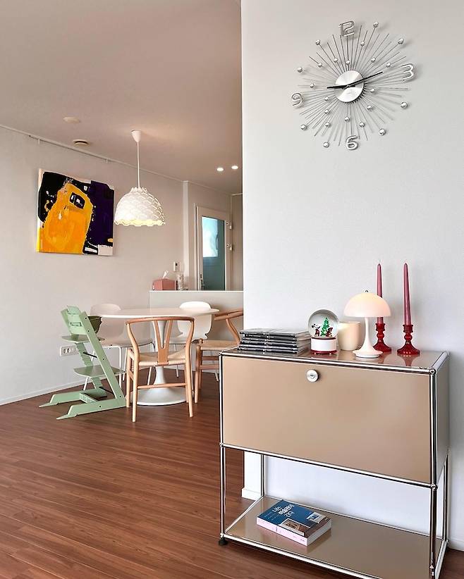 제가 가장 좋아하는 복도 쪽에서 바라 봤을 때 주방이 살짝 보이는 뷰에요. 저희 집의 아이덴티티를 보여주는 뷰인 것 같기도 해요. 저는 집에 컬러가 있어서 따뜻한 에너지가 있는 곳이길 바래서 그림도 컬러 가득한 것으로 걸어 봤어요. 많은 분들이 집 꾸미기에 잘 활용하시는 USM 제품은 티비 스탠드 옆에 두려고 구매했는데 복도 쪽 자리가 더 어울려서 이동했어요.
