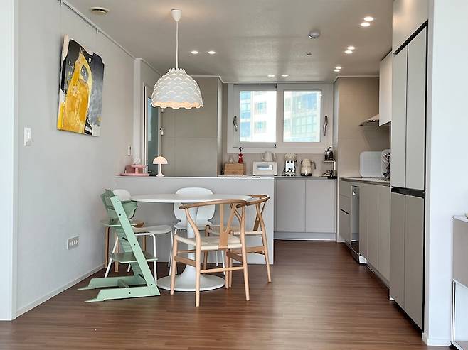 이건 개인차가 있을 수 있지만, 거실과 주방이 이어져 있어 넓어 보이고 공간 활용도가 좋아요!