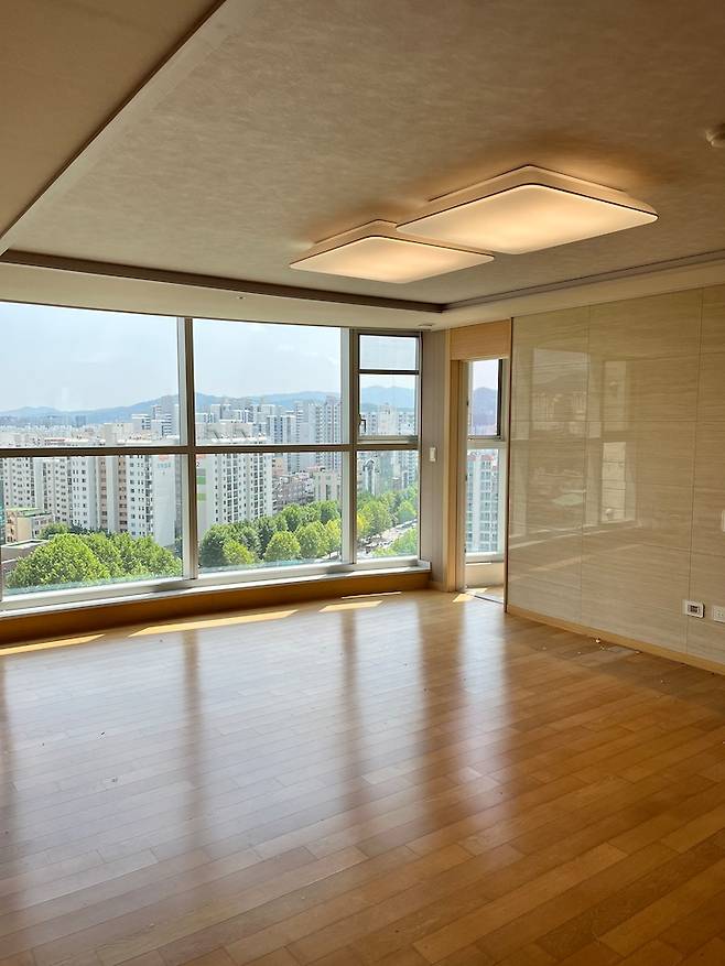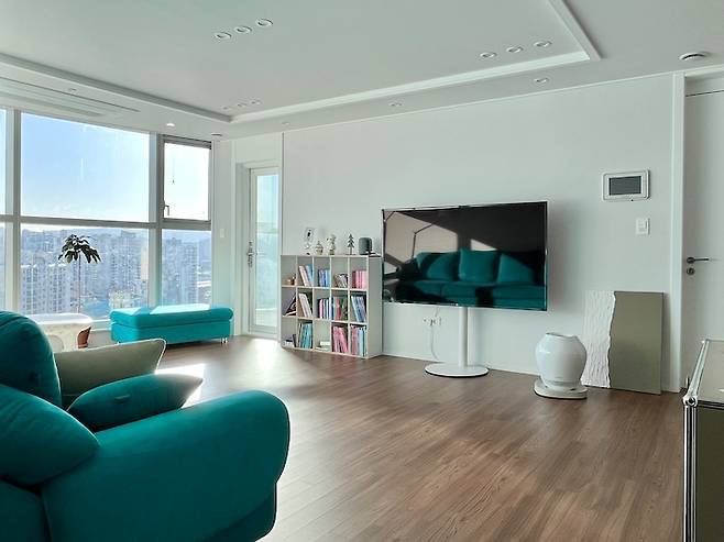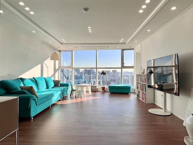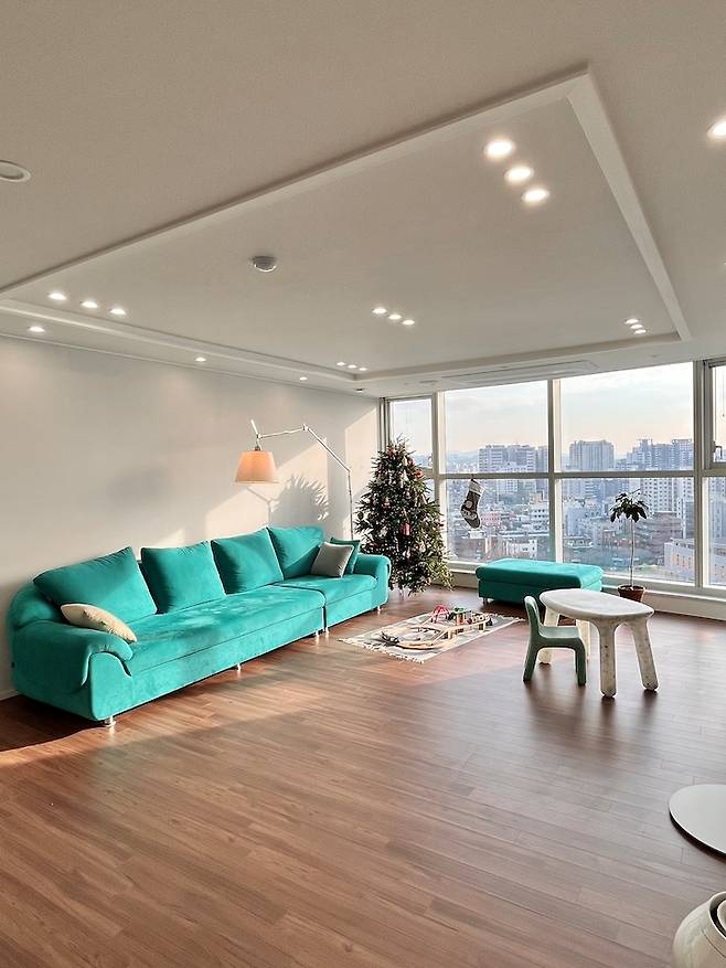 저희 집 거실은 통창이고, 층고도 보통 아파트 대비 10센치 정도 더 높아서 일반 샷시(새시)의 아파트들 보다 개방감이 있게 느껴져요. 정남향으로 4계절 중 겨울에 가장 빛이 많이 들어오는 거실이에요.