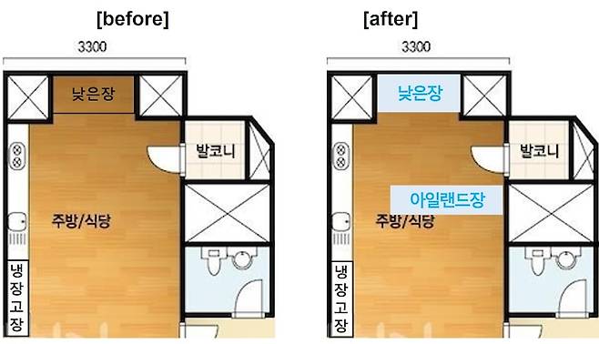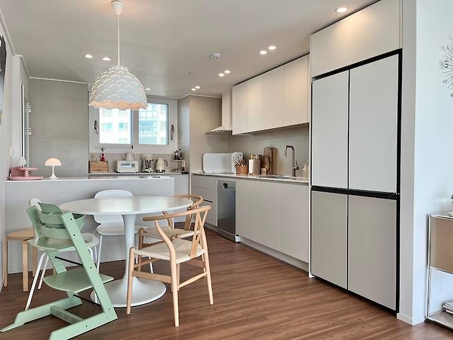 그래서 주방 구조를 냉장고장을 안쪽으로 넣고 ㄷ자 형태로 바꾸려고 했어요. 하지만 일정과 버짓상 어려움이 있어 고민하던 차에 냉장고장의 위치는 그대로 두고 기존의 일반 사이즈 냉장고에서 키친핏으로 "냉장고를 바꿨어요 ㅎ"