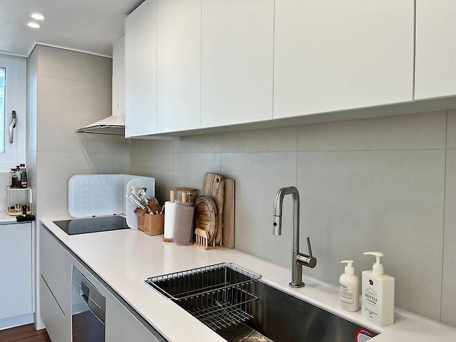 주방 구조를 보여드리려고 약간 측면으로 찍은 사진이에요. 인덕션-식기세척기-싱크대 순으로 되어 있어요. 인덕션은 창문에서 제일 가깝게, 식기세척기는 싱크대와 인덕션 중간에 위치해서 한 명은 요리하고, 나머지 한 명은 식기세척기에 정리하면서 함께 일할 수 있는 주방으로 구성 했어요!
