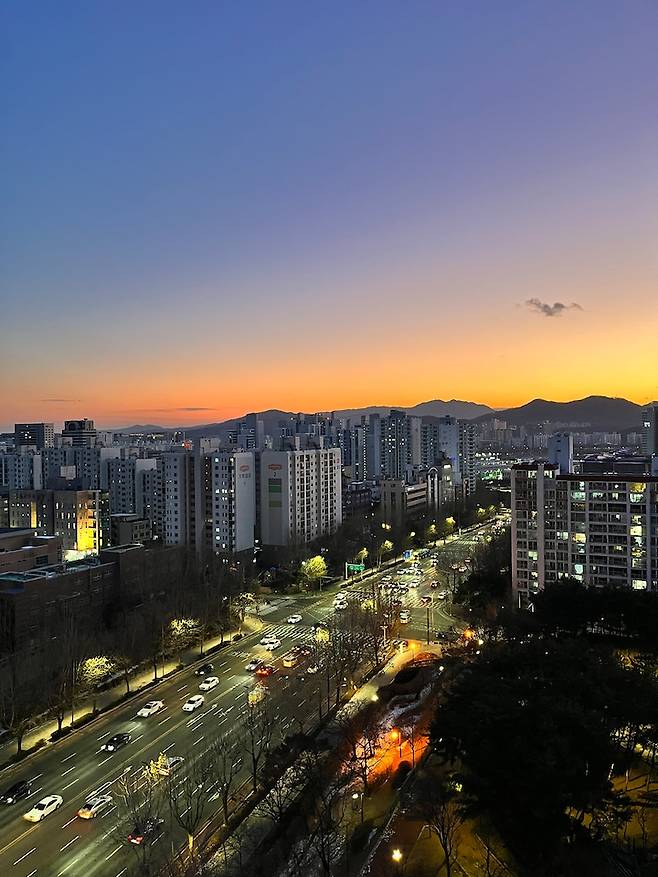 저희 집은 아파트지만 사방이 확 트여 있어서 뷰 맛집이에요! 빽빽한 아파트들이 대부분인 서울에서 이런 뷰를 매일 볼 수 있다는 것은 참 행운인 것 같아요. 거실에서 보는 뷰이고, 남향이라 노을이 정면으로 보이진 않지만 측면으로 살짝 틀면 황홀한 노을을 볼 수 있어요. 출근하는 날은 노을 보고 싶어서 서둘러 퇴근하고 싶어지기도 해요 ㅎ