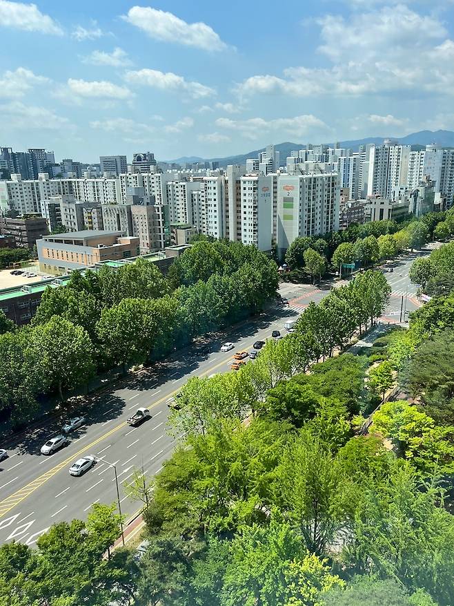이건 작년 여름에 찍은 뷰 사진인데, 초록초록 가로수들이 많은 동네이고, 바로 옆에는 소공원도 있어서 도심 느낌이 다소 덜해서 제가 좋아하는 뷰랍니다 ♥