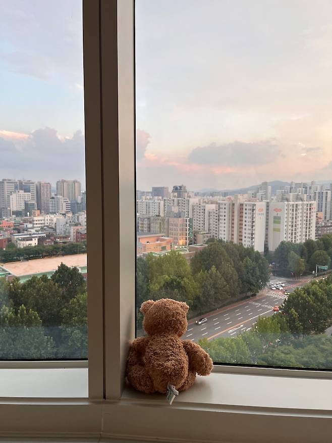 노을이 지는 저녁뷰를 즐기는 아기곰의 명상시간이에요. 거실을 넓게 쓰고 싶어서 아기곰이 앉아 있는 스툴 쇼파를 처분할까 했는데, 창문 앞에 앉아서 하늘멍 때리기 딱 좋은 위치에 둬서 처분 안하길 잘했다 생각했어요.