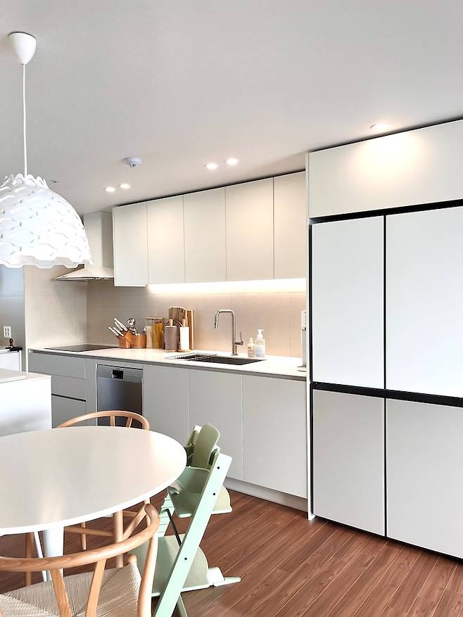 저희 집은 상부장과 하부장을 투톤으로 골랐어요. 올 화이트로 하면 단조로울 것 같아 하부장은 에토프 컬러 상부장은 화이트 컬러로 골랐어요. 상부장, 하부장의 컬러와 동일한 컬러로 냉장고 판넬을 선택해서 통일감을 줌으로써 주방이 훨씬 넓어보여요.