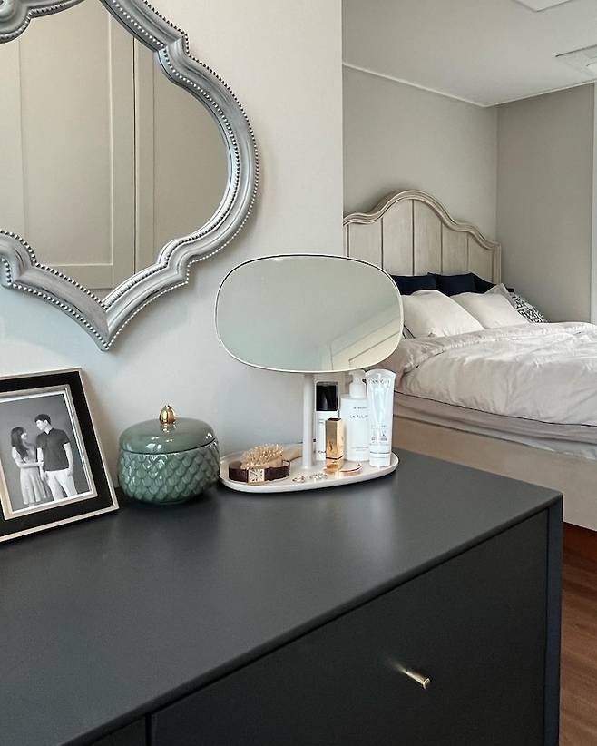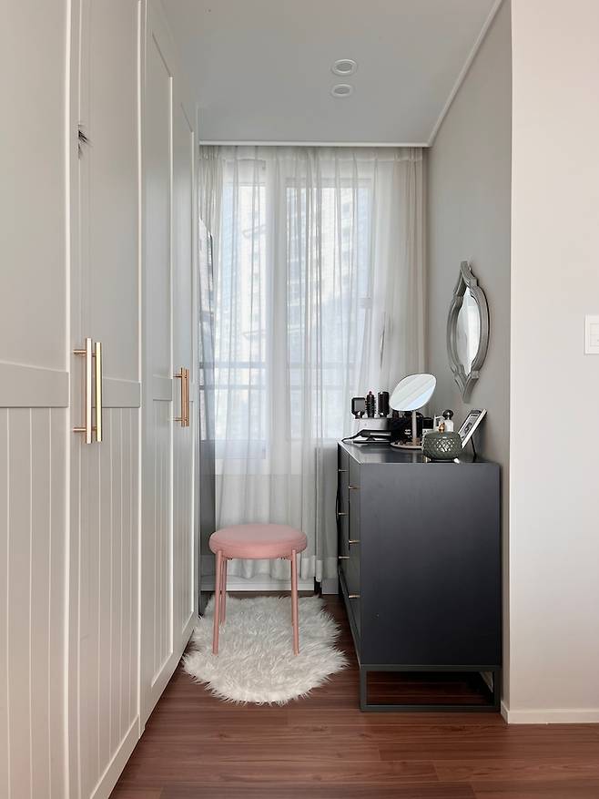 침실에 드레스룸은 없지만 파우더룸 스러운 공간이 있어서 이 부분에는 서랍장을 두고 화장대로 활용하고 있어요. 구조 상 낭비되는 공간이어서 알차게 활용하고 싶어서 고민이 많았던 공간이기도 해요.