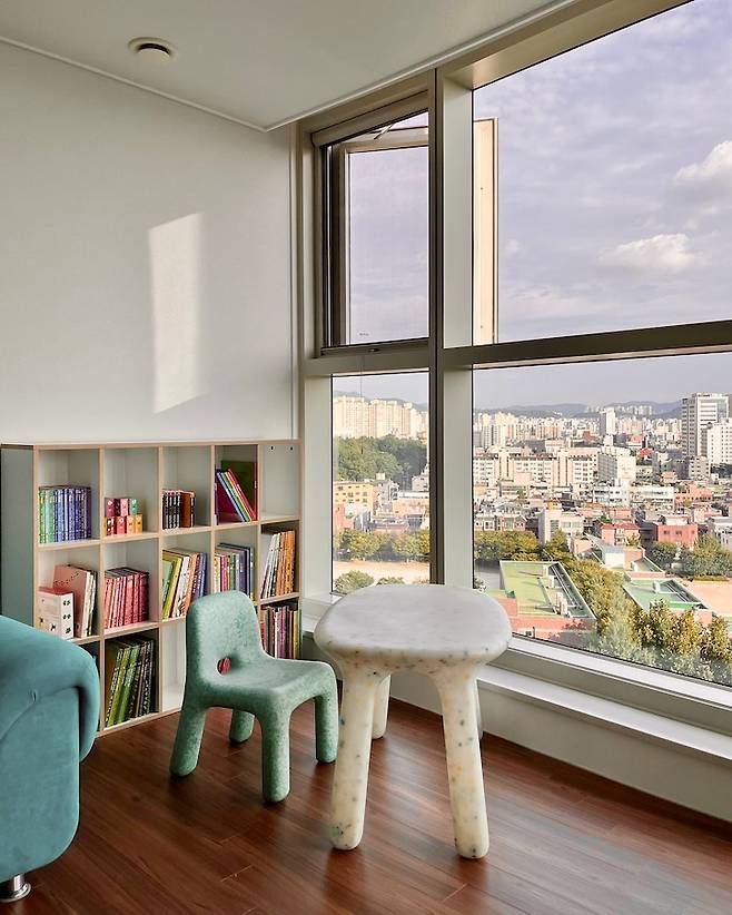 아기가 워낙 창 밖 뷰 보는 걸 좋아해서 가장 뷰가 좋은 자리에 아기 서재를 만들어줬어요. 이전에는 장난감 방에 책장도 함께 뒀는데, 그 배치에서는 장난감이 더 재미있다 보니 아이가 책을 꺼내지 않았어요. 과감하게 거실 한 켠에 만들어진 아기 서재는 아기가 가장 좋아하는 자리이기도 하고, 엄마 아빠와 다같이 책을 읽는 시간을 갖는 소중한 공간이 되었어요.