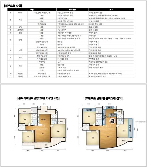 공사 범위는 샷시(새시), 가구, 안방 화장실을 제외한 전체로 정했습니다. 세부 내용은 아래에서 다시 한 번 설명 드릴게요!