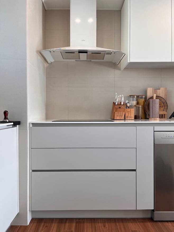 요리는 잘 못해도 6년차 주부라 이제 주방 사용법 정도는 알아서 주방 수납 짜면서 의견을 많이 드렸어요. 인덕션 아래에는 서랍 형태로 3칸을 넣어서 1) 커트러리 보관 칸, 2) 소소한 아이템 보관 칸, 3) 깊게 짜서 무거운 냄비 보관 칸으로 사용할 수 있도록 했어요.
