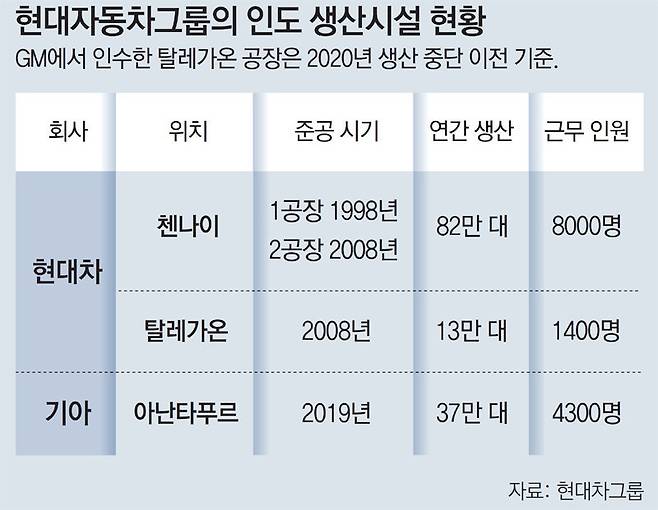 현대차는 인도를 한국 외 최대 제조 기지로 키운다는 목표 아래 첸나이와 탈레가온 공장의 생산 능력을 대폭 확장한다. 현재 100개국 이상에 인도 생산 차량을 수출하고 있는 현대차는 증가하는 내수와 글로벌 수출 물량을 동시에 만족시키기 위해 연간 100만대 생산 체제를 구축했다.
